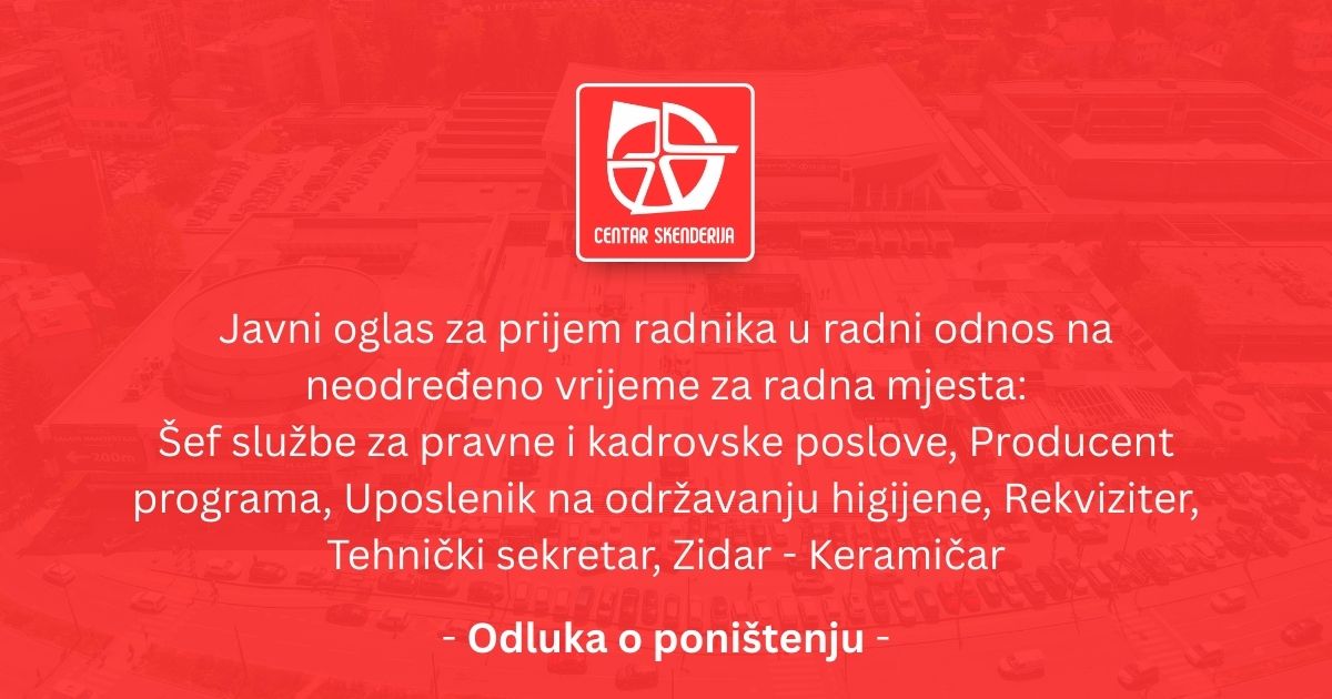 Poništava se Javni oglas za prijem radnika u radni odnos na neodređeno vrijeme na pozicijama: Uposlenik na održavanju higijene, Zidar – Keramičar, Rekviziter, Tehnički sekretar, Šef službe za pravne i kadrovske poslove, Producent programa.