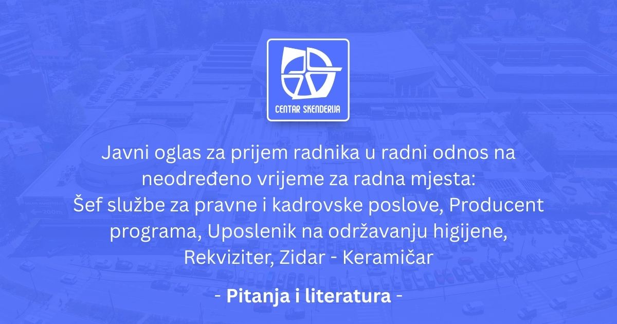 Objava pitanja i spisak literature za pismeni i usmeni ispit za Javni oglas za prijem radnika u radni odnos na neodređeno vrijeme u KJP Centar Skenderija d.o.o. Sarajevo na pozicije: Šef službe za pravne i kadrovske poslove, Producent programa, Uposlenik na održavanju higijene, Rekviziter, Zidar – Keramičar.