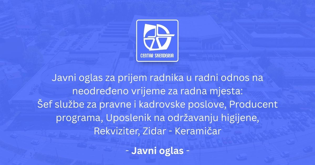 KJP Centar Skenderija raspisala je Javni oglas za prijem radnika u radni odnos na neodređeno vrijeme na pozicije: Stručni saradnik za zaštitu na radu i zaštitu od požara, Finansijski knjigovođa, Likvidator. Preuzmite: Poslovnik o radu komisije...