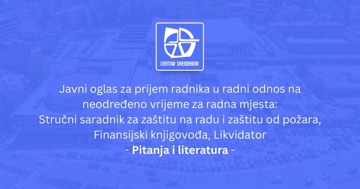 Objava pitanja i spisak literature za pismeni i usmeni ispit za Javni oglas za prijem radnika u radni odnos na neodređeno vrijeme u KJP Centar Skenderija d.o.o. Sarajevo na pozicije: Šef službe za pravne i kadrovske poslove, Producent programa, Uposlenik na održavanju higijene, Rekviziter, Tehnički sekretar, Zidar - Keramičar