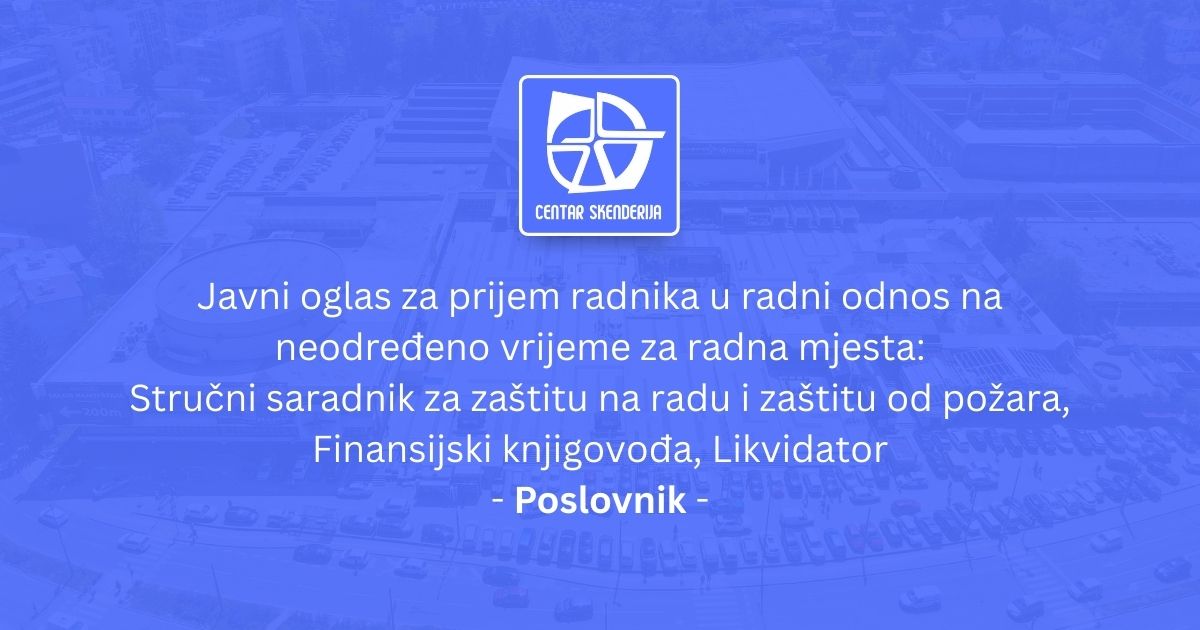 KJP Centar Skenderija d.o.o. Sarajevo raspisuje Javni oglas za prijem radnika u radni odnos na neodređeno vrijeme na pozicije: Stručni saradnik za zaštitu na radu i zaštitu od požara, Finansijski knjigovođa, Likvidator.