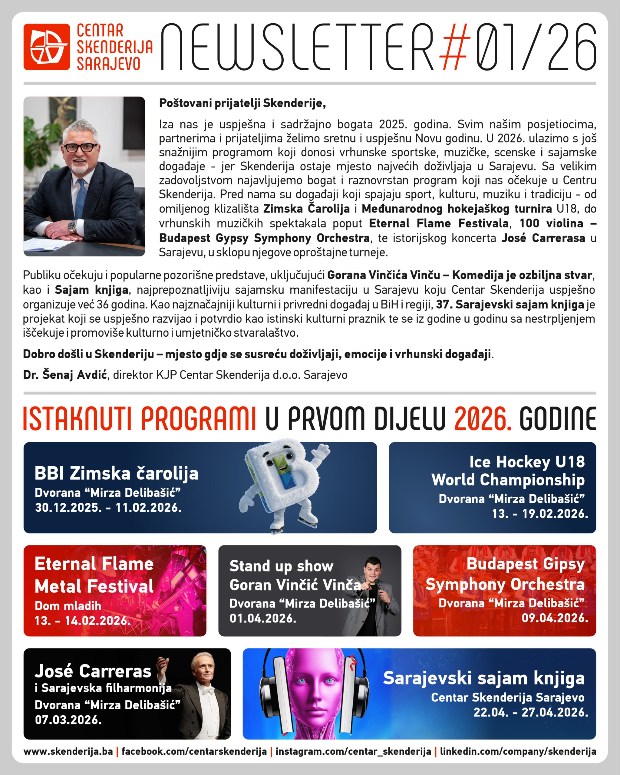 Iza nas je uspješna i sadržajno bogata 2025. godina. Svim našim posjetiocima, partnerima i prijateljima želimo sretnu i uspješnu Novu godinu. U 2026. ulazimo s još snažnijim programom koji donosi vrhunske sportske, muzičke, scenske i sajamske događaje – jer Skenderija ostaje mjesto najvećih doživljaja u Sarajevu. Sa velikim zadovoljstvom najavljujemo bogat i raznovrstan program koji nas očekuje u Centru Skenderija. Pred nama su događaji koji spajaju sport, kulturu, muziku i tradiciju – od omiljenog klizališta Zimska Čarolija i Međunarodnog hokejaškog turnira U18, do vrhunskih muzičkih spektakala poput Eternal Flame Festivala, 100 violina – Budapest Gypsy Symphony Orchestra, te istorijskog koncerta José Carrerasa u Sarajevu, u sklopu njegove oproštajne turneje.